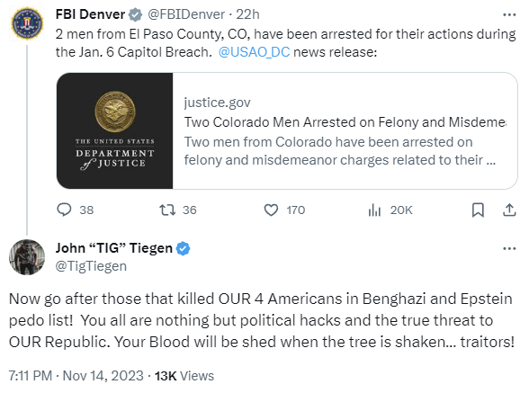 Via 9NEWS’ Kyle Clark, here is former Colorado Springs candidate for mayor and armed militia commander John “Tig” Tiegen having a normal one, which for “Tig” normal being threats to “shed blood” of FBI agents following the arrest yesterday of two more Colorado-based accused January 6th, 2021 insurrectionists: