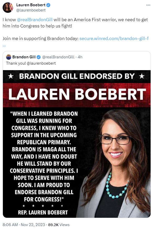 When you first Google the name Brandon Gill, Google assumes you’re searching for the actor who appeared in such films as The Sorcerer’s Apprentice and an installment of the Big Momma franchise. But no, we’re talking about the real Brandon Gill–who you probably haven’t heard of either, but there’s a good reason why Lauren Boebert has: