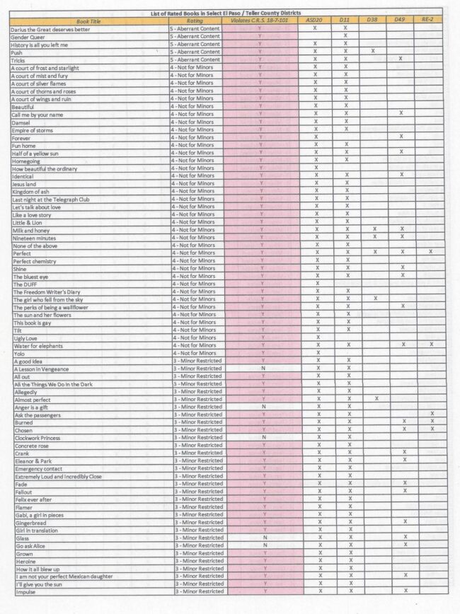 There are two more pages like this of books that Republicans want banned in Colorado Springs.