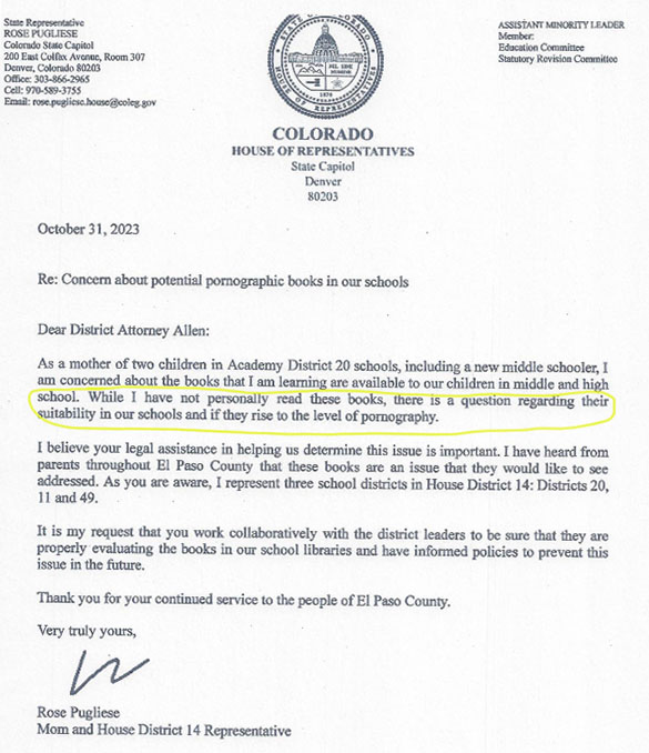 The petition also includes this amazeballs letter of support from State Rep. Rose Pugliese — the Assistant Minority Leader in the House — readily acknowledging that she supports this book banning goal even though SHE HASN’T EVEN READ ANY OF THE BOOKS ON THE LIST: