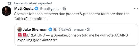 UPDATE #3: No word yet from George Santos’ friend Rep. Lauren Boebert, who voted with the minority to keep Santos in Congress, but before the vote she signaled her intentions clearly: