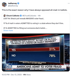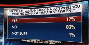 Ridiculous “news” outlets such as The Washington Examiner and Fox News ran with these poll results without bothering to take 10 seconds to think about how absurd they truly are. Fox News included a breathless segment this week with the chryon “Americans Admit to Voter Fraud” underneath this stupendous image: