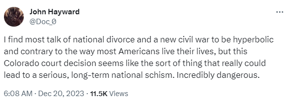 From here, we could descend into the dregs of every kind of demeaning remark about the state of Colorado, the name-and-shame campaign against the majority Justices in yesterday’s ruling, and the innumerable even less carefully-worded threats of violence that have flooded social media in the last 20 hours. In their ruling the majority acknowledged the controversy of ruling on this weighty and divisive question, but made clear they would not be intimidated: