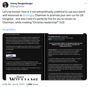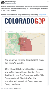 As you may recall, Williams also ran for CO-05 in 2022 but lost by more than 15 points to “Zombie” Doug Lamborn. He spent a good deal of time in his first few months as GOP Chair bashing Lamborn via Colorado Republican Party platforms. Can Williams really remain as State Party Chairman while he runs for Congress against other Republicans? Legally, it’s not clear. Ethically, the answer is unequivocally “NO,” and plenty of other Republicans are upset about it.