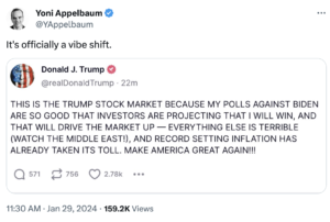We particularly like the line about how inflation “has already taken its toll.” When you have to shift your narrative from “things are terrible” to “things WERE terrible” to “things are better because of me,” you’re not winning the argument.