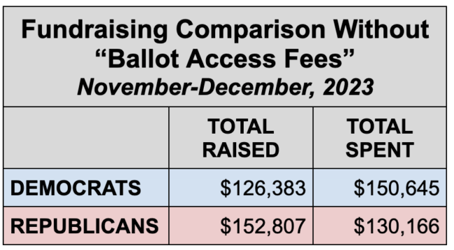 In the last two months of 2023, the Colorado Republican Party reported raising a total of $312,807…but more than half of that total ($160,000) came from the Colorado GOP’s bizarre ballot access fee grift for Presidential candidates (including this “Ryan Binkley” person). Without that money, the Colorado GOP actually raised $152,807 in November and December 2023. Here’s what the contributions and expenditures for each major political party in Colorado look like without the GOP grifting: