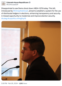 DeGraaf’s latest “election reform” attempt (HB24-1279) was a bunch of gibberish about “distributed ledgers” and “tally status reports” and something to do with blockchains that would require a significant overhaul of a Colorado election system that is working very well already. DeGraaf’s argument was full of all of the same nonsense election conspiracy theories we’ve heard since 2020, including the “MAGA” Republican obsession with paper ballots and a requirement for a statewide hand count of election results. Nearly 3.3 million Coloradans cast ballots in the last Presidential election in 2020. Just try to imagine setting up a hand count of 3.3 MILLION BALLOTS.