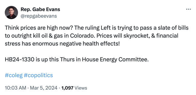 Republican State Rep. Gabe-ish Evans, who is also running for Congress in CO-08, is upping the rhetoric dial to 100 on a new oil and gas bill in the Colorado legislature: