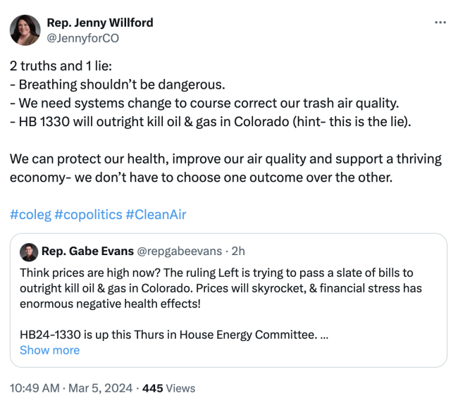 Democratic State Rep. Jenny Wilford — one of the sponsors of HB24-1330 — responded quickly via the platform formerly known as Twitter: