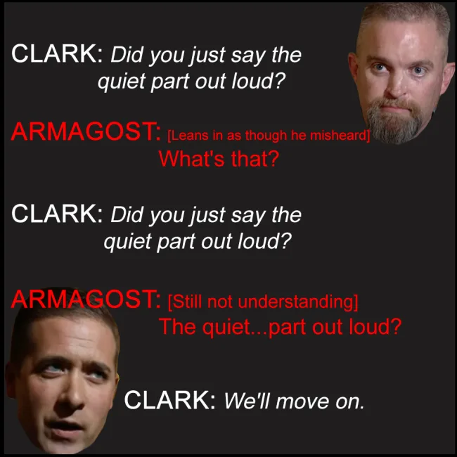 Finally, after much sweating and stammering, Armagost admits the real truth: