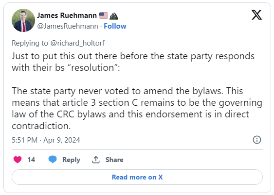 Before Saturday, April 6, pursuant to Colorado State GOP bylaws Article III, Section C, neither the Colorado State GOP nor any officer could endorse a candidate in a contested primary election. “With more than 10 candidates running to replace Ken Buck (CO, R), there was no question the CD4 race was highly contested. Dave Williams continued to abuse his office as State GOP Chair by trying to bypass all Republican delegates and voters in eastern Colorado with an endorsement concocted by his own hand. This is not only unethical, but possibly illegal.” said Holtorf…