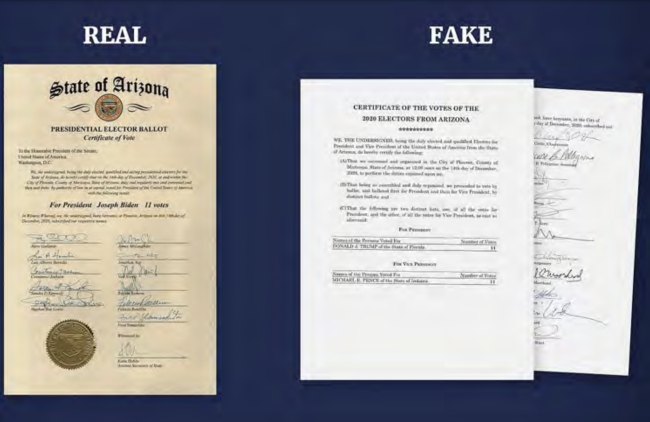 - Creating, signing, or filing a list of false presidential electors with specified state or federal entities.