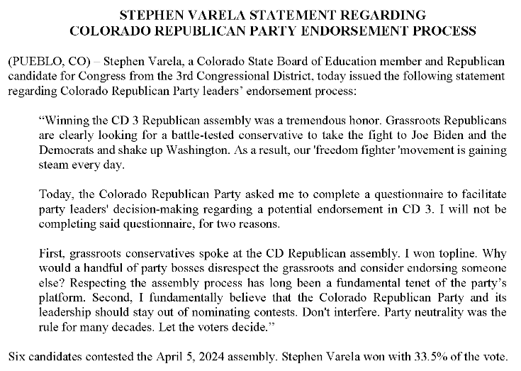Also yesterday, CO-03 Republican (for now) candidate Stephen Varela put out a statement of his own that suggests an endorsement is coming in the Republican CO-03 primary, and he also is refusing to play: