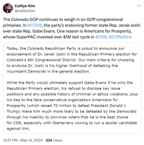 “While the Party would ultimately support Gabe Evans if he wins the Republican Primary election, his refusal to disclose key issue positions and any possible history of criminal or ethics violations, plus his ties to the face conservative organization Americans for Prosperity (which raised 70 million to defeat President Donald J. Trump) make him much more likely to be defeated by the Democrats through his inability to convince voters that he is the best choice for CD8, especially with libertarians vowing to run a spoiler candidate against him.”