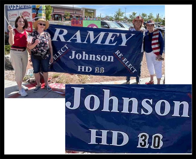 This is certainly odd, but it’s not quite as sad as the banner that Johnson and friends are carrying around town in which the new House District number (30) has been pasted over the old number (23).