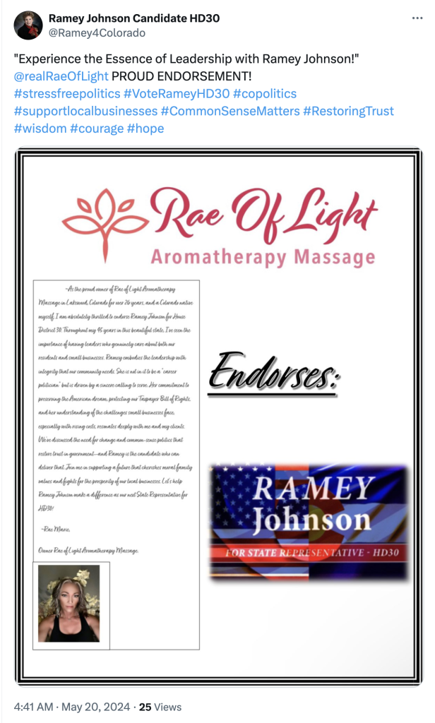 For example, Johnson this morning announced a new endorsement of her candidacy via her “X” account…from a Lakewood aromatherapy massage business owner. We’d tell you what it says, but the font used in the message is difficult to decipher: