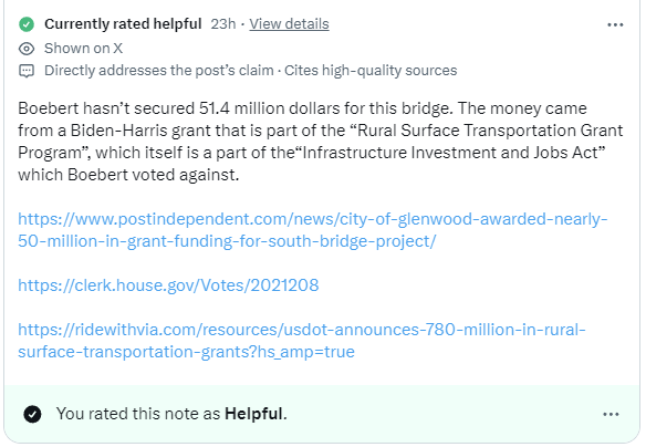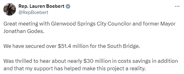 Yesterday, Rep. Boebert was at it again, soaking up the love for over $50 million in funding for a bridge project in Glenwood Springs: