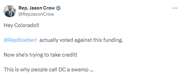 Since this isn’t the first time that Boebert has tried to take credit for programs she voted against, sometimes getting the jump on fact-checkers, Democrats starting with Rep. Jason Crow wasted no time calling Boebert out: