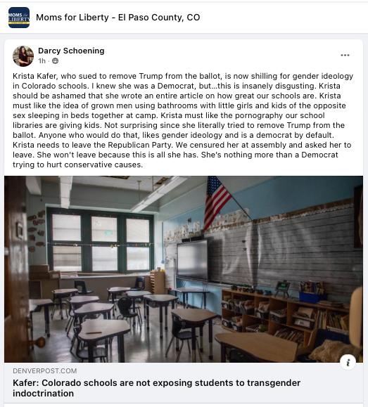 In short, the Colorado Republican Party says that Republicans should leave public schools because of transgenderism, or whatever, and the author of that proclamation thinks anyone who disagrees — such as Kafer — should also leave the Colorado Republican Party. The good news for Kafer is that she could do the latter and not have to do the former. For Republicans, this is not the way you make friends and influence people…or keep a political party from dying off in front of your eyes.