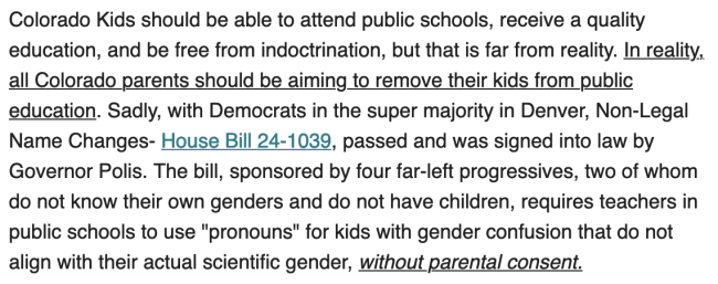 As evidence, it claims a male teacher named Ms. Sparks uses the 3rd grade girls’ restroom at Grand Peak Academy in Colorado Springs with the principal and school board’s approval. The email also references “House Bill 24-1039 … [which] requires teachers in public schools to use ‘pronouns’ for kids” that do not correspond with their biological sex. To prevent kids from being indoctrinated by Democrats, the Colorado GOP implores “all Colorado parents… remove their kids from public education.”