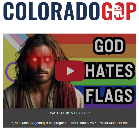 This Pride Month, the Colorado GOP managed to top last year’s anti-LGBTQ+ vitriol with a message that appears to be cribbed directly from the infamous Westboro Baptist Church, who gained infamy years ago with their celebrations at soldier’s funerals of the “Wrath of God” for America tolerating LGBTQ+ people: