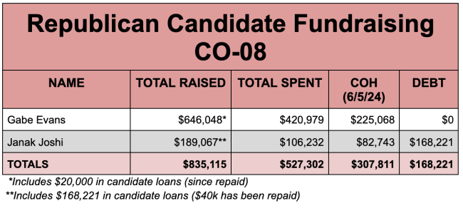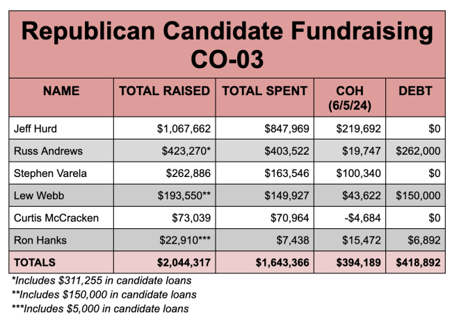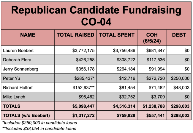 If you remove Boebert from that total, the other 15 candidates have raised $4,843,742 — or about one-fourth of what Frisch and Caraveo have raised combined. About $1 million of that total also comes from candidate loans, so the 15 Republicans not named Boebert are really getting less than $4 million in contributions from other people.