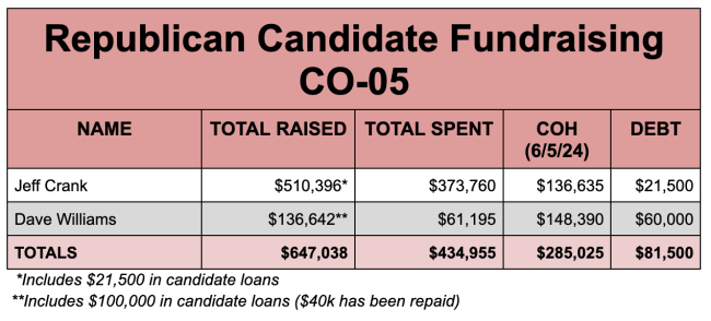 It’s true that these numbers don’t account for money being spent in these races by outside committees, particularly Americans for Prosperity (or by the Colorado Republican Party itself, in the case of Dave Williams). But these figures also don’t account for third-party money that will be spent to help Frisch and Caraveo later this summer and into the fall.