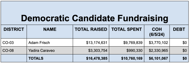 Now, compare these numbers to the fundraising totals of just TWO Democratic candidates: Adam Frisch in CO-03 and Rep. Yadira Caraveo in CO-08: