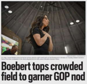 As Andrew Kenney at Colorado Public Radio reports, the last, best chance to put an end to one of the consistently craziest reality TV spectacles in modern American politics died with a whimper last night as calumnious carpetbagging calamity for Christ Rep. Lauren Boebert rolled to victory over five hapless also-rans in the CO-04 Republican primary to succeed Rep. Ken Buck: