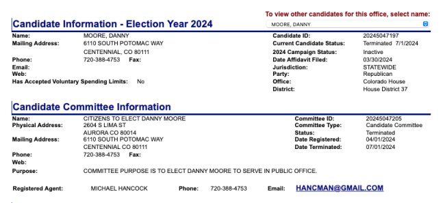 According to the Colorado Secretary of State’s TRACER website, Moore terminated his State House committee on Monday after spending a few hundred bucks and raising no dollars: