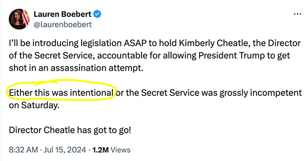 Earlier this week — before she filed her idiotic legislative proposal to fix Secret Service management by not paying them — Boebert had been suggesting that it was the Secret Service that was trying to assassinate Donald Trump rather than a troubled 20-year-old kid from a hard-right MAGA family.