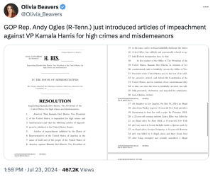 As Forbes reports, Tennessee Republican Rep. Andy Ogles filed articles of impeachment today against Harris for…something: