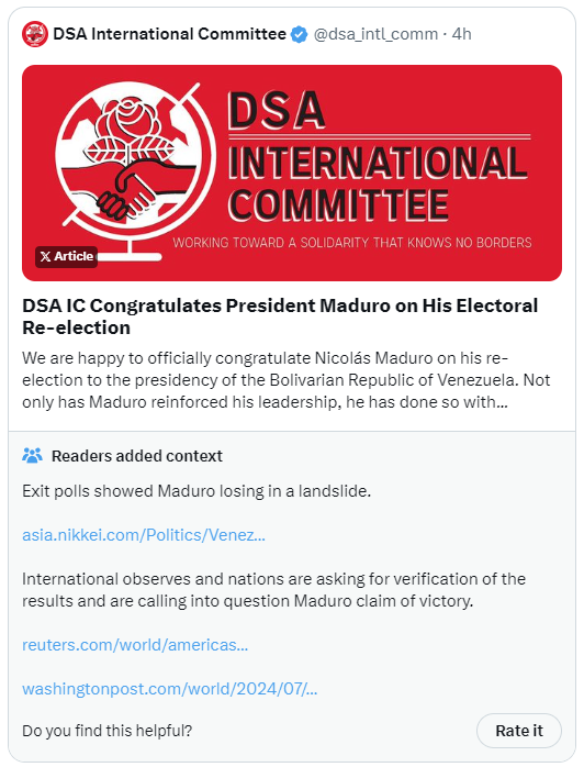 If Republicans were interested in exploiting the situation more thoughtfully, instead of bashing Venezuelan refugees rallying for freedom in Aurora, they’d be slamming the Democratic Socialists of America for what may be the most ill-conceived press statement on the Venezuelan election we’ve seen from anyone except maybe Maduro himself: