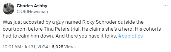 In spite of being confined to home (except for her court appearances) and having to wear an ankle monitor, Peters has continued to use regular appearances on right-wing podcasts to gin up support for her trial, encouraging listeners to “Stand with Tina.” Recent posts on the platform X urge supporters to come to her trial to protest, wave signs, and publicly pray for her acquittal.