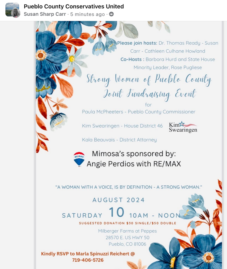 As you can see, one of the hosts of Saturday’s Strong Women of Pueblo event is not like the others! Susan Carr, Cathleen Culhane Howland, Colorado House Minority Leader Rose Pugliese, Barbora Hurd, the spouse of CO-03 GOP nominee Jeff “Bread Sandwich” Hurd and admittedly maybe the one who should be running for Congress…