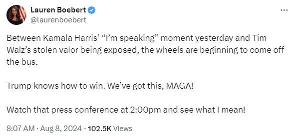 Minutes before her son’s case was called, Lauren Boebert posted a message on her official X account at 8:07 a.m. local time, attacking Harris, the Democratic presidential nominee, and her running mate, Minnesota Gov. Tim Walz.