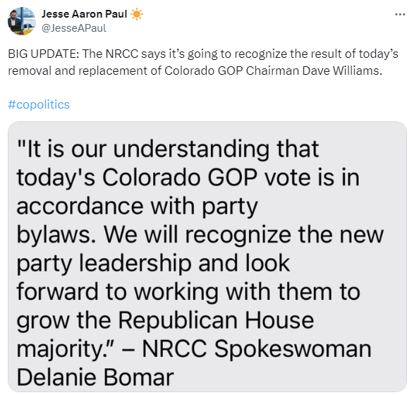 It’s an overwhelming result from those present at this meeting, but it’s crucial to remember that Williams and party leadership instructed their supporters on the Central Committee not to attend a meeting they have declared “null and void,” insisting that no such vote will be valid before the party’s next “regular” meeting set for next weekend in Castle Rock at the party’s infamous meeting under a literal bridge in Bayfield last month. It’s a good assumption that if a similar vote goes forward next weekend the margin will be closer.