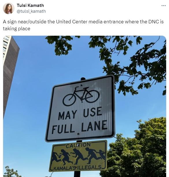 One white sign reads “Blacks must sit at the back of the bus. Kamala’s migrants sit in the front.” Another yellow caution sign on the same pole warns riders of “Kamala’s illegals,” with imagery of people running that is supposed to mimic immigrants crossing the border.