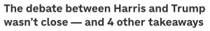 Liam Donovan, Republican strategist: Harris stopped short of closing the deal with the audience at home, but she successfully baited Trump into self-indulgent, spittle-flecked tangents that squandered a prime opportunity to sow doubts about his opponent…