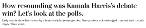 The CNN poll showed Harris winning the debate 63 percent to 37 percent among debate-watchers, while the YouGov poll showed her winning 54-31 among registered voters who watched at least some of the debate, with 14 percent unsure.