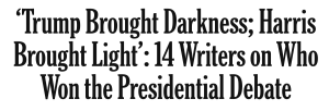 …David French, Times columnist Harris won, and it wasn’t close. That doesn’t mean this debate will be decisive (the nation is too closely divided, and we’re too far from Election Day to make that judgment), but Harris accomplished everything she wanted to accomplish. She was poised, confident and passionate. By contrast, Trump grew steadily angrier and more conspiratorial as the night went on. It was as if Harris had been debating an avatar for MAGA Twitter and not a former president of the United States.