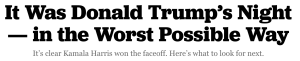 Harris made it Trump’s night — in the worst possible way. The campaign armed Harris with a series of trip wires hoping that Trump would be unable to resist setting them off. Not only did Trump take the bait, he brought a couple of his own, which he tripped over again and again. It was as if Lucy showed up with half a dozen footballs for Charlie Brown to kick, and Charlie himself brought a few more for good measure…