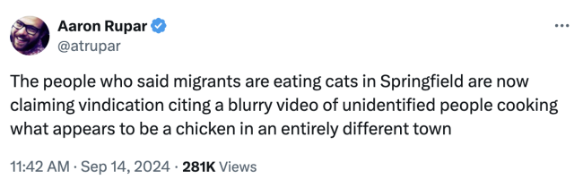 Both Vance and Donald Trump, Jr. took to social media to allege that there was some sort of proof of their claims about pet-eating migrants, pointing as evidence to this ridiculous video on ‘X’ that offers no context or clue about what is actually happoening. As journalist Aaron Rupar noted on ‘X’: