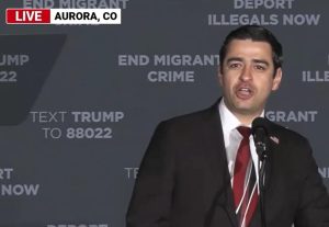 Evans has also trying to explain his position on U.S. immigration policy, which has gained new attention in the wake of Republican Presidential candidate Donald Trump’s visit to (sorta) Aurora on Friday. The primary purpose of Trump’s Aurora visit was to scare voters into believing that Venezuelan gangs had killed and or raped everyone in Colorado because of permissive Democratic policies (ridiculous claims that Evans has embraced). Evans spoke to the gathered MAGA masses prior to Trump’s appearance, standing in front of a background that included messages such as, “End Migrant Crime,” and “Deport Illegals Now.” Congressperson Lauren Boebert also spread her message of hate for immigrants before Trump stepped onstage to verbalize his xenophobic wet dream with a proposal titled, “Operation Aurora.”