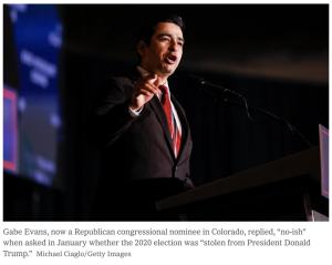 Today in The New York Times, reporter Annie Karni highlights the Republican candidates for Congress across the country who are election deniers and right-wing extremists on a variety of social issues. The star of this story is Republican Gabe Evans, who is seeking to unseat incumbent Democratic Rep. Yadira Caraveo in the eighth congressional district. Karni begins with the origin story about how Evans earned his “Gabe-ish” nickname: