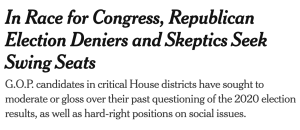 House Republicans who have denied the 2020 election results or refused to commit to accepting the 2024 outcome, and who hold more extreme views on social issues, are running in critical congressional races throughout the country. They are poised to replace the mainstream conservatives who once formed the spine of the G.O.P. in Congress, and who have either left or been purged by a party that regards them as insufficiently hard-line or insufficiently loyal to Mr. Trump. [Pols emphasis]