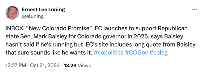 Mark Baisley isn’t going to be Colorado’s next Governor, but he has a decent chance of becoming the Republican nominee in 2026 because somebody has to do it. We’ve heard other Republican names bandied about, including State Sen. Barbara Kirkmeyer, so there is some strategic benefit to Baisley getting out in front of other potential GOP hopefuls. More names should start to trickle out in another month or so.