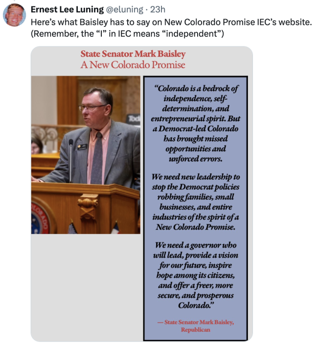 Blah, blah, blah. The registered agent for “New Colorado Promise” is a guy named Charles Gantt, whose name pops up regularly on various committee filings (always for Republicans). In short, this IEC is almost certainly a Washington DC-based infrastructure vehicle to assist Baisley in the 2026 election cycle.