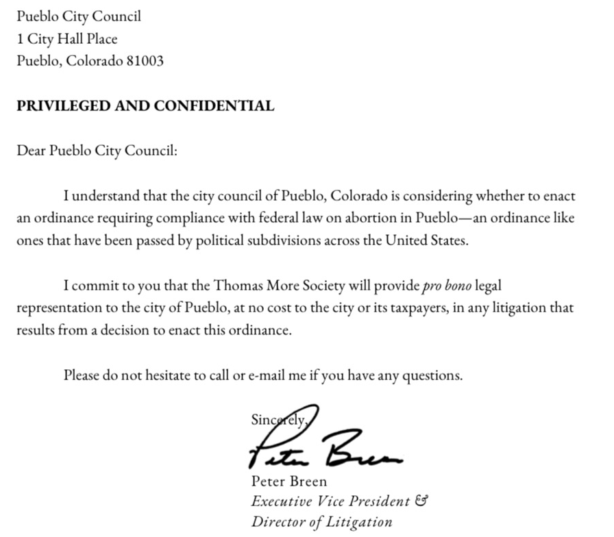 If you’re asking what authority the Pueblo City Council has to pass an ordinance in direct contravention of the statutory protections for abortion rights in Colorado, that’s the whole point and you’re not alone. Much like a similar effort a year ago introduced by the same right-wing Councilor Regina Maestri, the purpose of this ordinance is to provoke a legal challenge from the Colorado Attorney General and move the challenge to what they hope will be friendly conservative federal courts. In a “confidential” September letter to the city council, the right-wing Thomas Moore Society offered to provide pro bono legal representation to defend the ordinance if passed–but that wasn’t enough to convince two personally pro-life councilors,who voted to turn down the “opportunity” for Pueblo to commit to years of litigation as the test case for a national anti-abortion agenda.