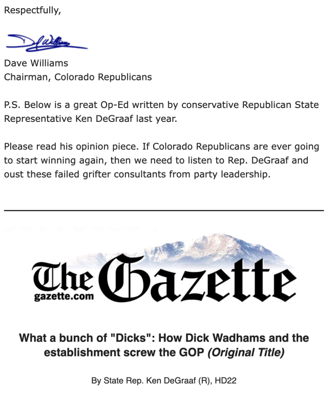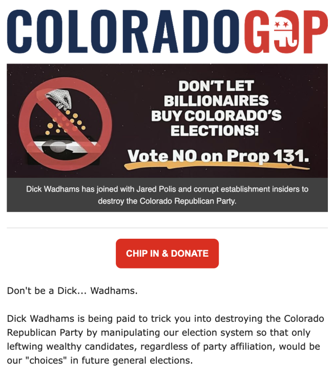 The latest Colorado GOP newsletter/call to action out this morning is tangentially about the State Republican Party’s opposition to Proposition 131, the ballot measure seeking to change Colorado’s election system to an “open primary” process and a four-candidate runoff in a General Election. But the newsletter is mostly about hating on former State Republican Party Chairman Dick Wadhams, who has long been a vocal critic of current State GOP Chair Dave Williams.
